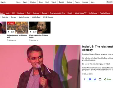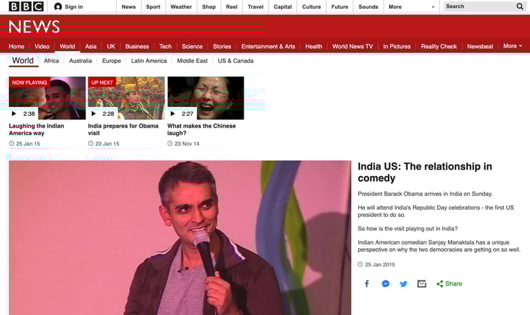 His live performances have been featured on the BBC multiple times, CNN.com, Comedy Central India, Forbes Magazine, 9GAG and Buzzfeed, and most major publications.